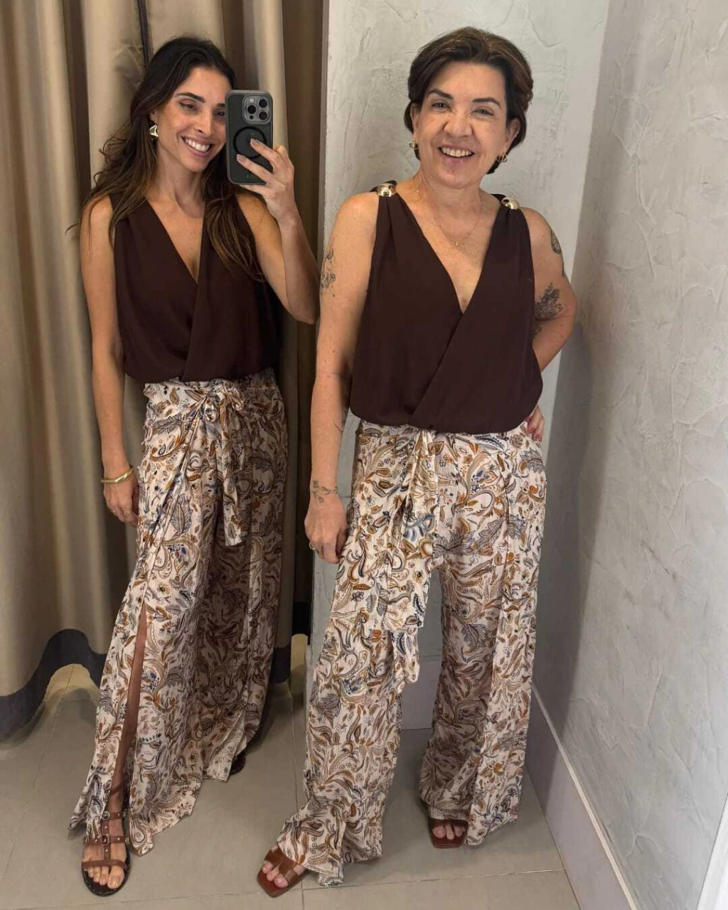 Peça que une charme e praticidade com decote V profundo, porém delicadamente velado no colo, trazendo um toque arrojado com pedraria dourada sobre os ombros, conferindo um brilho sutil e sofisticado.