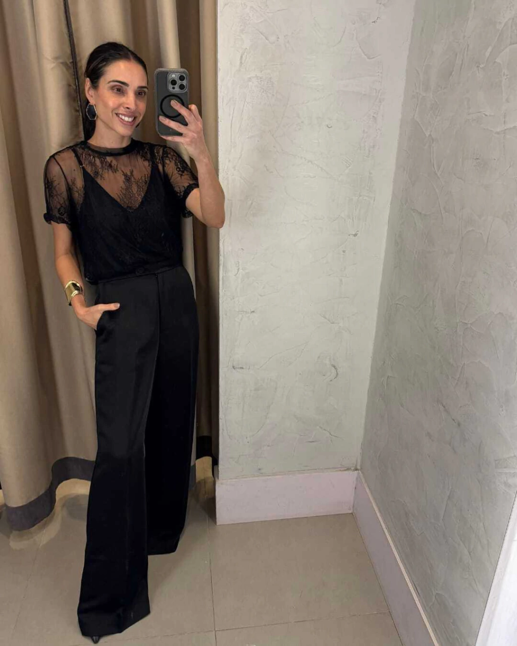 Bolsos faca, a calça apresenta modelagem ampla com liberdade de movimento. Atemporal, compõe produções elegantes transitando até as casuais, o equilíbrio ideal entre alfaiataria e conforto.