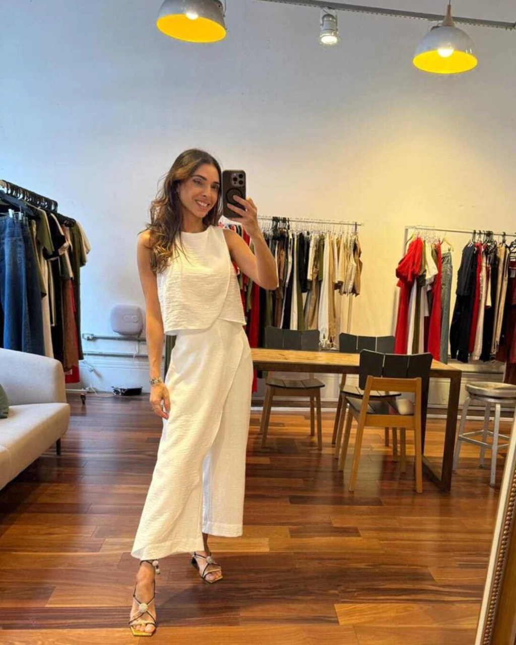 A calça destaca-se pelo recorte transpassado na altura do cós, proporcionando conforto e a blusa transpassada complementa a peça com charme, valorizando com sutileza. O conjunto é perfeito para quem busca versatilidade e estilo em produções do dia a dia.