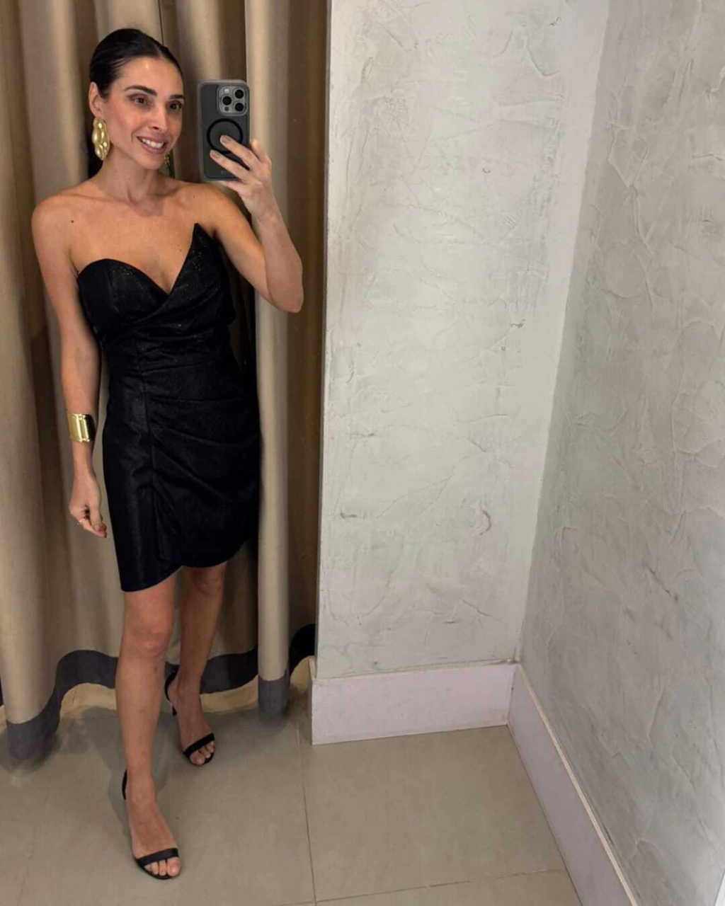 Levemente acetinado, vestido mídi destaca-se por brilho discreto o design sem alças e decote assimétrico adiciona um charme único e contemporâneo. Modelagem indispensável para quem deseja discrição com classe.
